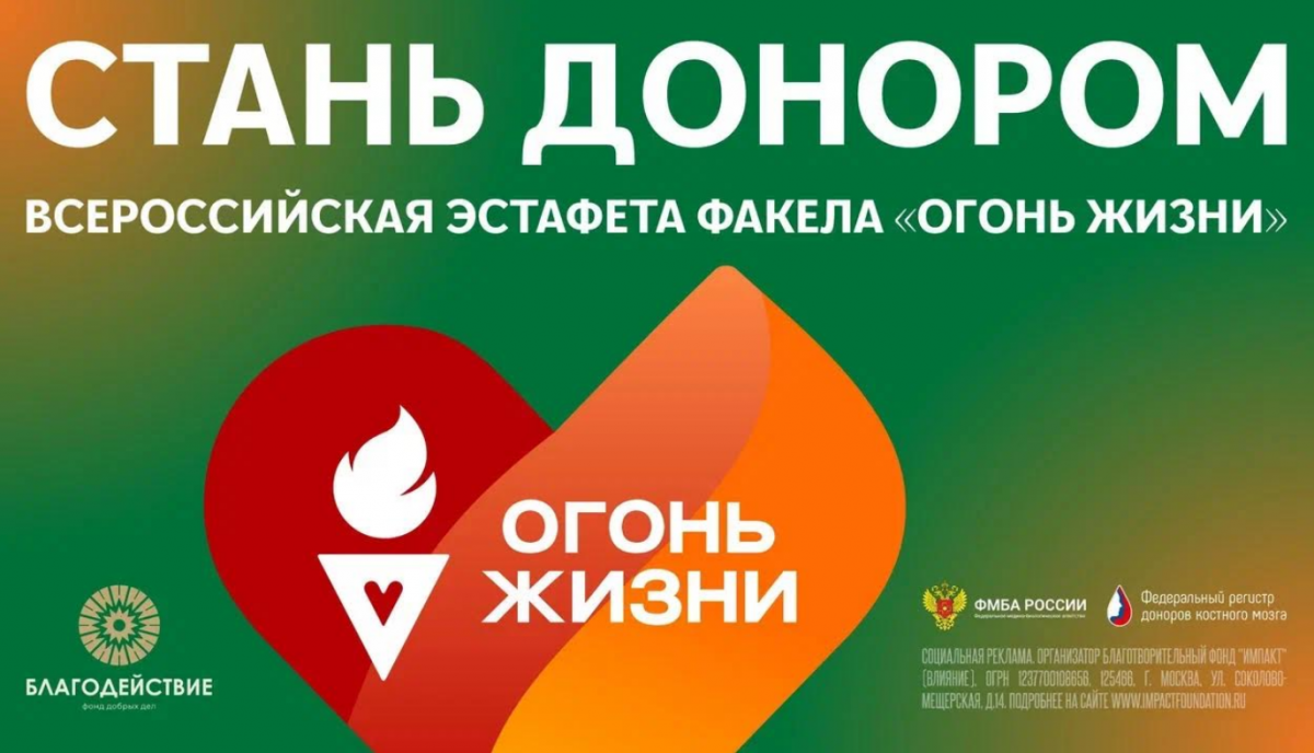 Эстафету организуют ФМБА России, Фонд добрых дел "Благодействие" и Фонд поддержки социальных инициатив "Огонь жизни". Первый этап объединил более 50 городов, привлекая свыше 84 тысяч участников, из которых 50 тысяч сдали кровь, а регистр пополнился на 8 тысяч доноров.