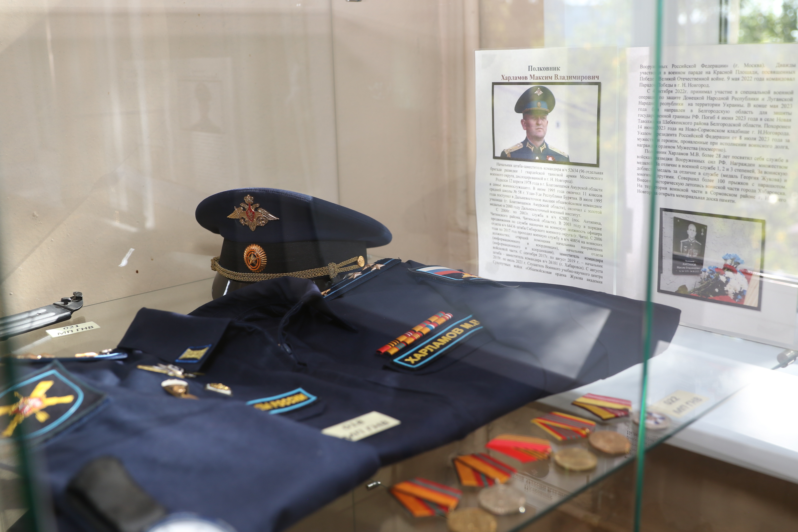 Центральное место в экспозиции занимает стенд, посвящённый полковнику Максиму Харламову, погибшему при исполнении воинского долга. Его вдова Елена Харламова выразила надежду, что музей станет не только местом памяти, но и центром патриотического воспитания будущих поколений. Дочь полковника Харламова, Дарья, ученица 11 класса, добавила, что выросла в атмосфере патриотизма и убеждена: чувство ответственности за страну нужно воспитывать с детства.