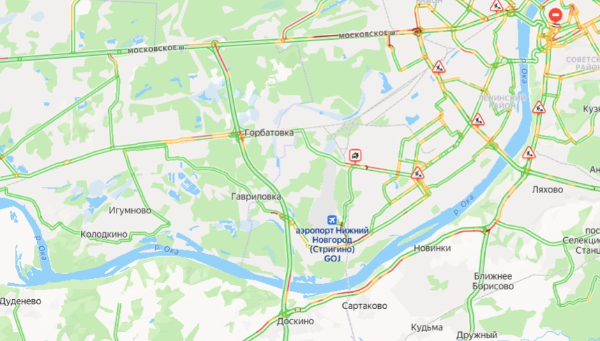 Сильнее всего движение затруднено на Московском шоссе, а также в районах села Доскино и деревни Ольгино. Водители сообщают о плотном трафике и в других частях города — вблизи аэропорта, в Горбатовке и на Стригинском мосту.