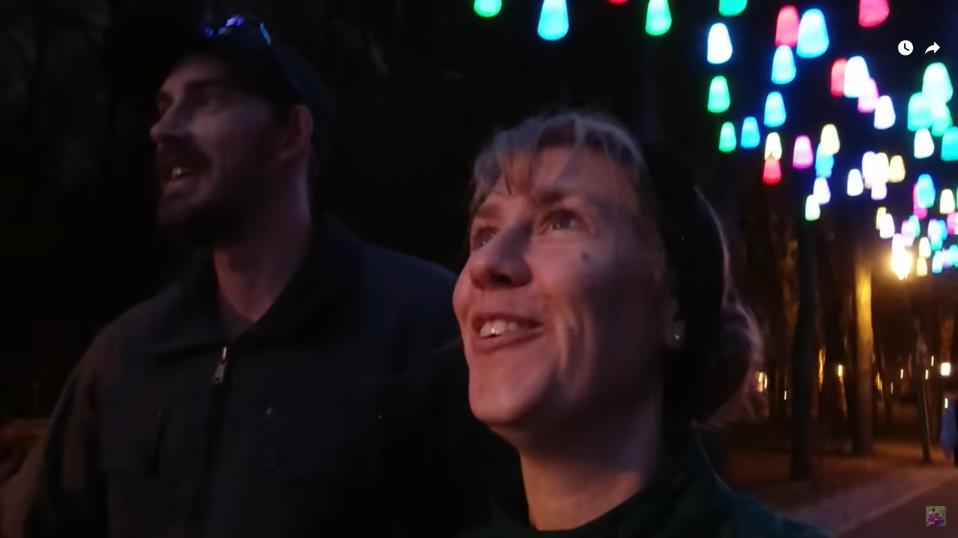 Во время вечерней прогулки по парку "Швейцария" Хэйр успели осмотреть центральную площадь, полюбоваться скульптурой шишки, пройтись по тропинкам среди деревьев, где впечатлились иллюминацией - фонариками.