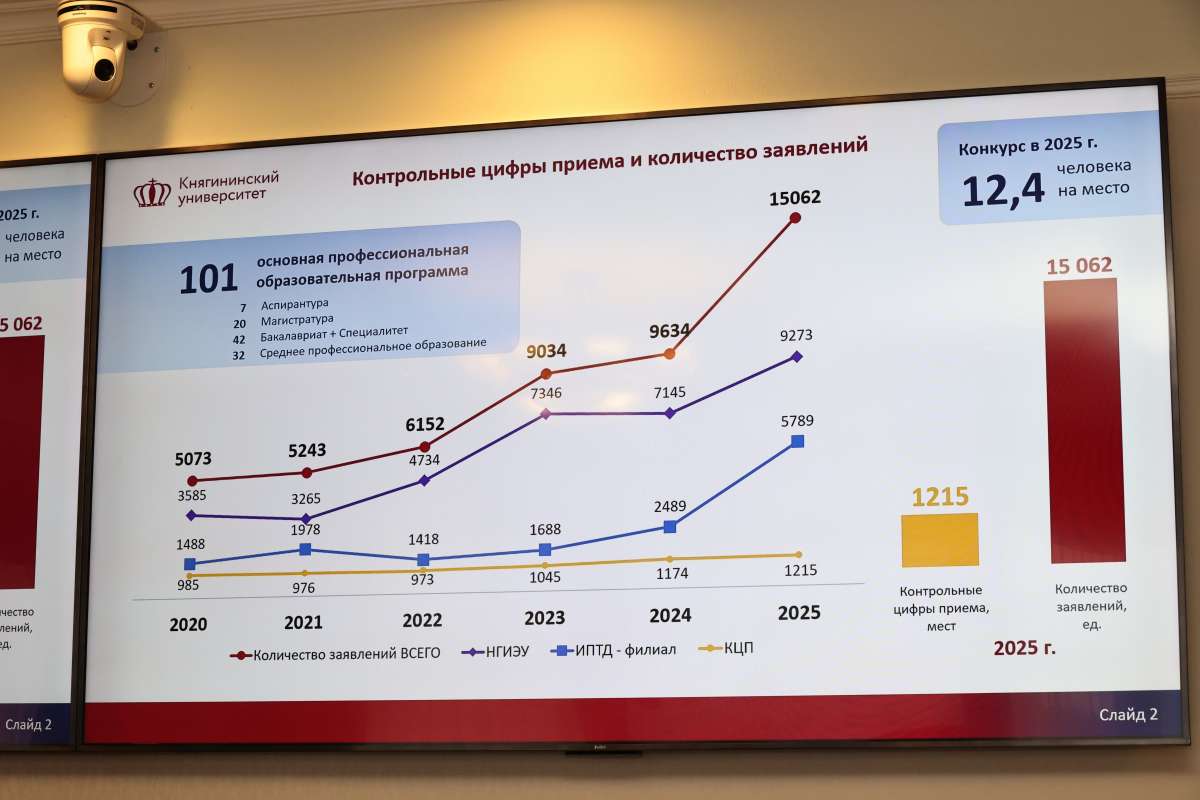 Так Княгининском университете в 2025 году на 1215 бюджетных мест было подано более 15 тысяч заявлений. Что составило более 12 человек на место. За 5 лет количество заявлений от потенциальных абитуриентов выросло в 3 раза.