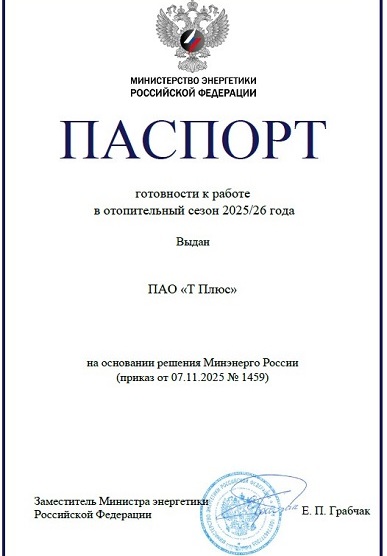 Министерство энергетики России выдало «Т Плюс» паспорт готовности к работе в отопительный период 2025-2026 годов. Документ подтверждает, что региональные филиалы компании выполнили все необходимые условия, чтобы обеспечить надёжную работу электростанций и тепловых сетей в условиях максимальных нагрузок предстоящей зимой.