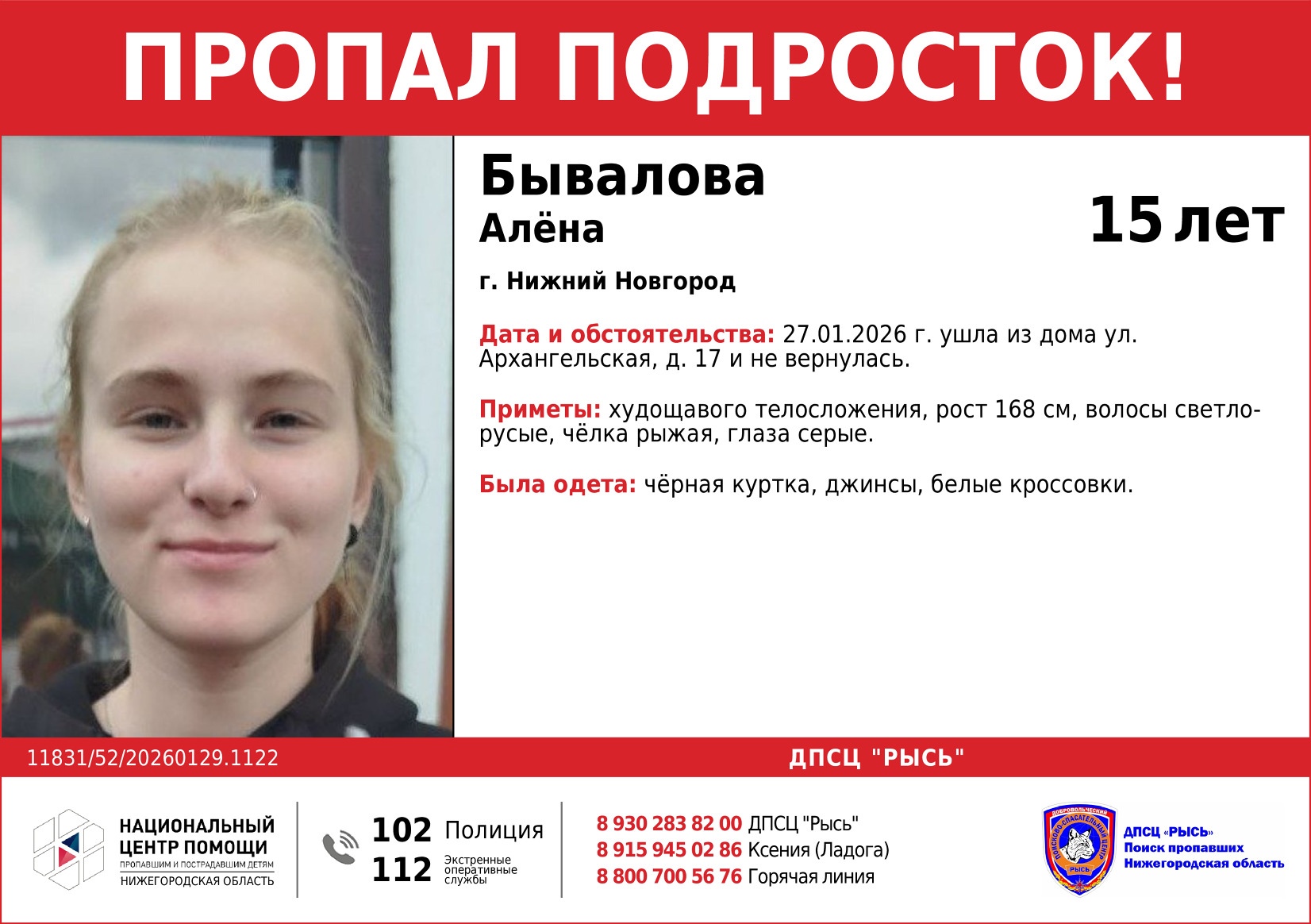 В Нижнем Новгороде разыскивают 15-летнюю Алёну. Девочка исчезла 27 января после того, как вышла из дома на улице Архангельской. С этого момента она перестала выходить на связь.