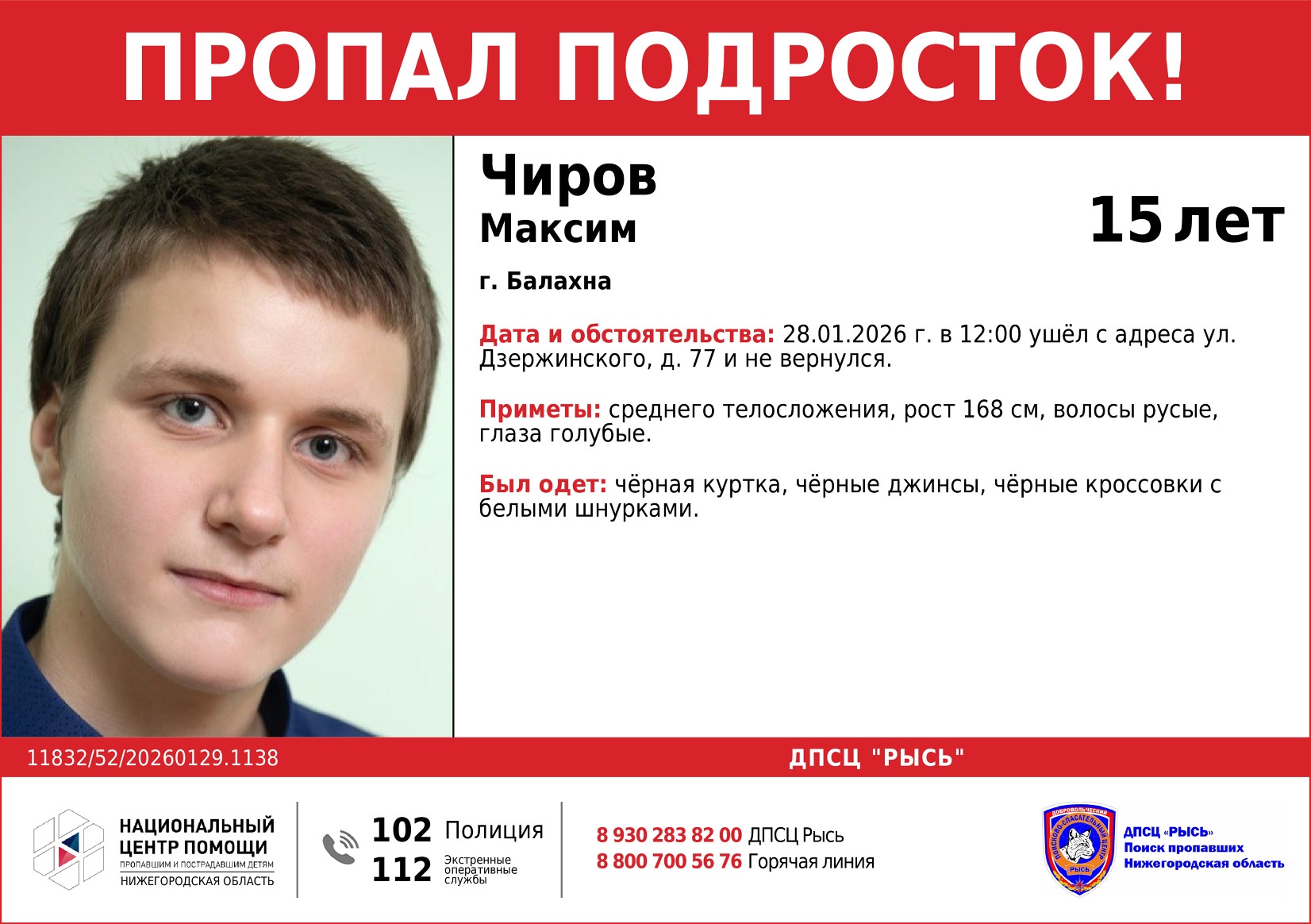 В Балахне пропал 15-летний Максим. Накануне он ушел из детского дома, расположенного на улице Дзержинского, и не вернулся. Подросток был одет в черную куртку и джинсы. Он среднего телосложения, ростом 168 см, с русыми волосами и голубыми глазами.