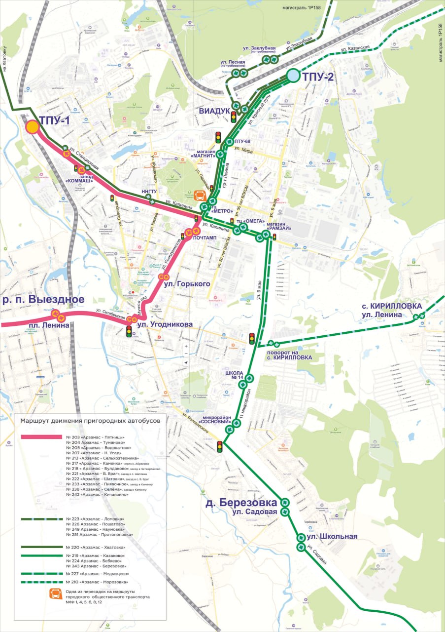 От ТПУ-1, расположенного возле железнодорожного вокзала Арзамас-1, будут отправляться автобусы в село Пятницы (№ 203), деревню Малое Туманово (№ 204), села Водоватово (№ 205), Новый Усад (№ 207), рабочий посёлок Выездное, улица Сельхозтехника (№ 213), село Каменка (№ 217), село Булдаково через село Четвертаково (№ 218), село Пушкарка через сёла Васильев Враг и Шатовка (№ 222), деревню Пиявочное (№ 233), село Селема через село Каменка (№ 238), а также в село Кичанзино (№ 242).