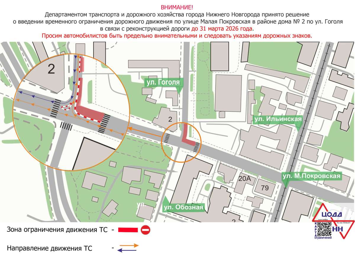 Движение транспорта ограничили на Малой Покровке и улице Гоголя в районе дома №2 до 31 марта. Как сообщили в городском дептрансе, это связано с реконструкцией дороги.