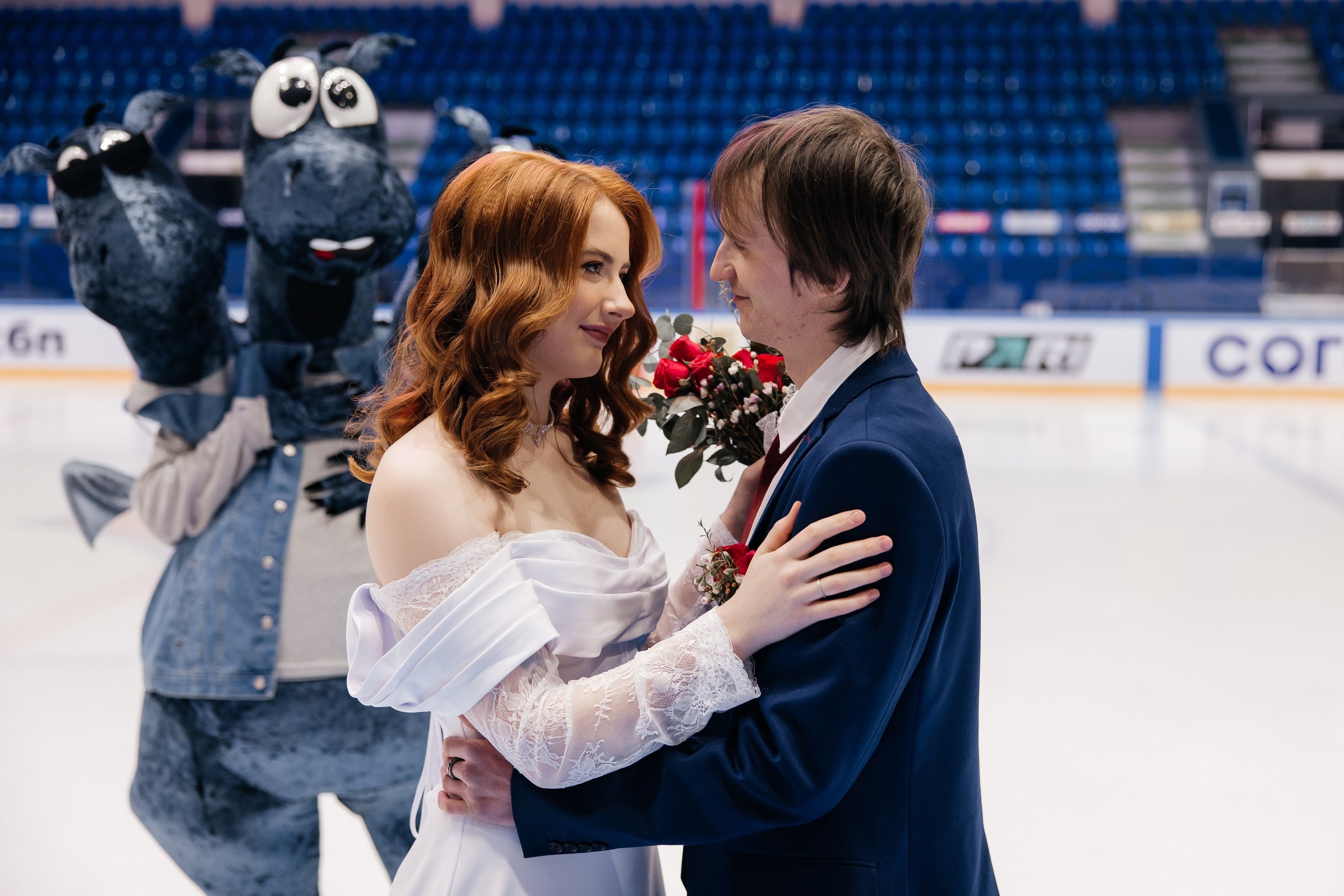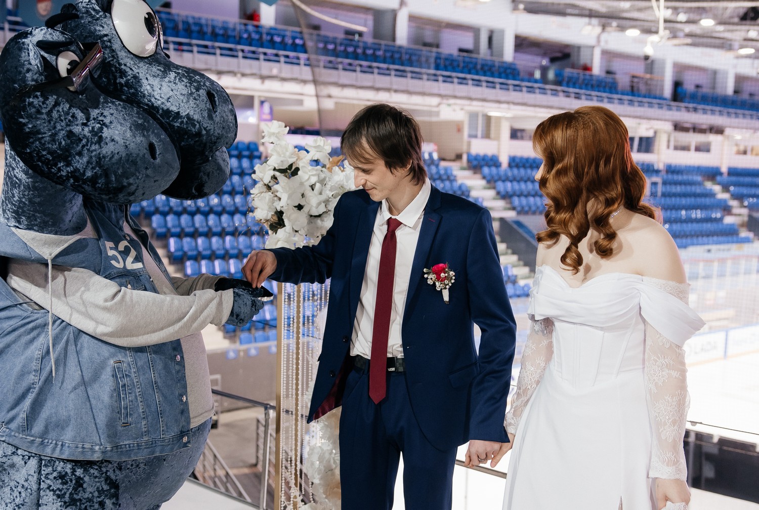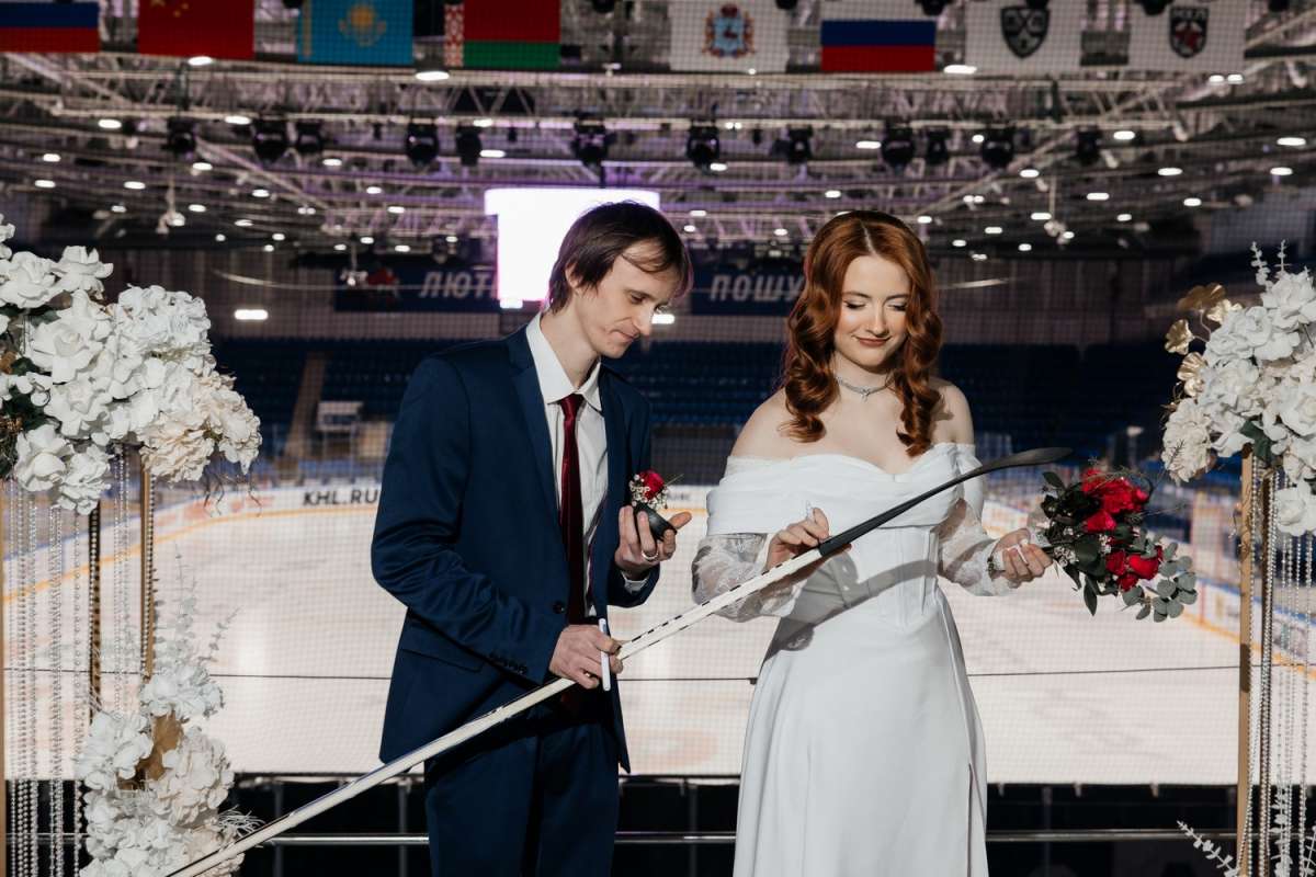Сергей Борисов и Анастасия Кудрявцева решили, что их день должен пройти необычно, и как только узнали о новой площадке для выездных регистраций, сразу подали заявку. Вместо традиционной книги они расписались на хоккейной клюшке и шайбе — эти предметы пара собирается хранить как семейные талисманы.