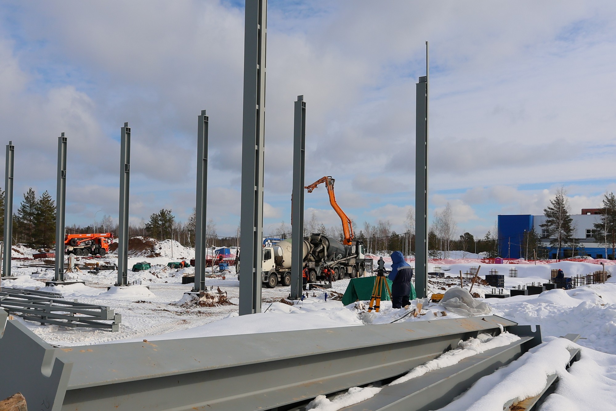 Одновременно возводятся промышленно-производственные корпуса. На площадке выполняют устройство фундаментов, монтаж металлических и железобетонных конструкций, а также установку фасадных панелей.
