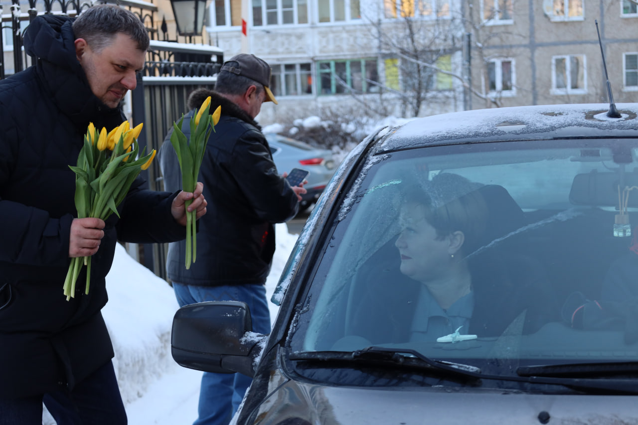 Первой точкой стал 422 Военный госпиталь Министерства обороны Российской Федерации. С самого утра участники акции встречали сотрудниц медицинского учреждения у входа, вручая им яркие тюльпаны.