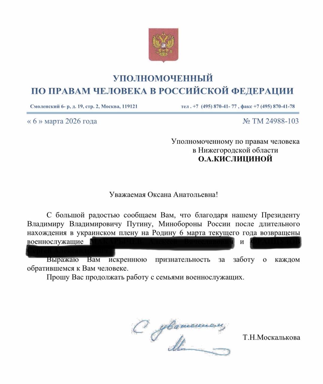 Омбудсмен также обратилась к семьям военнослужащих, которые продолжают ждать возвращения своих близких.
