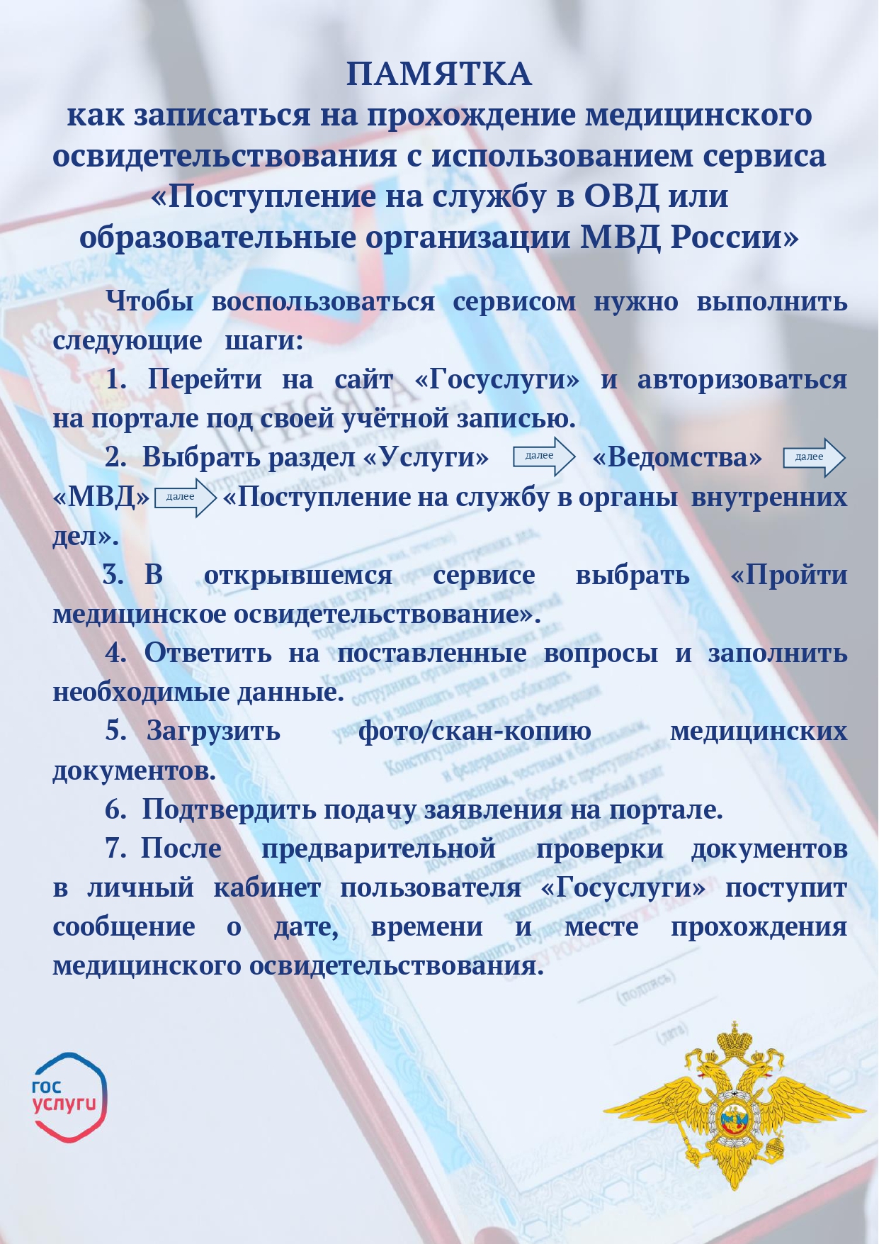 Кроме того, функционал сервиса позволяет кандидатам самостоятельно выбрать дату и время прохождения военно-врачебной комиссии в медицинской организации МВД России.