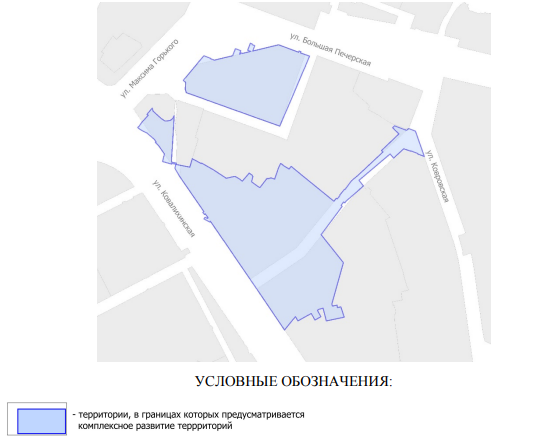 Документ предлагает отобразить на карте зону КРТ в границах улиц Большой Печерской, Максима Горького и Сеченова. Общественные обсуждения по проекту продлятся до 20 марта.