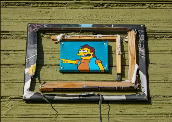 Работы с персонажами культового мультсериала на этом месте появляются с 2023 года. Первой стала картина-оммаж на знаменитую фотографию группы The Beatles: по "зебре" шагало семейство Симпсонов. Однако полотно вырезали из подрамника.
