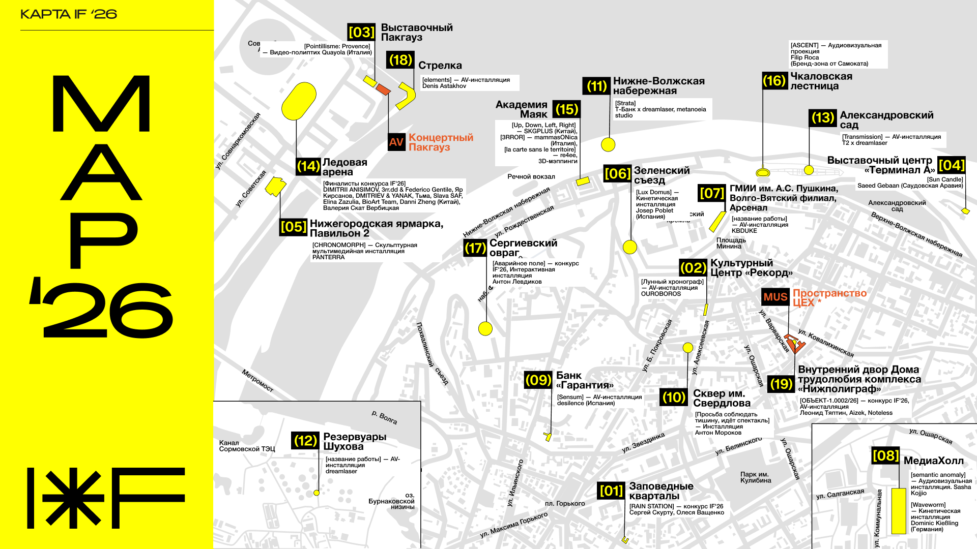 В 2026 году фестиваль пройдет в Нижнем Новгороде с 23 по 26 апреля. Он объединит 23 площадки по всему городу. Внутренние пространства и открытые городские территории станут частью бесплатной мультимедийной выставки, а также будут задействованы в программе событий.