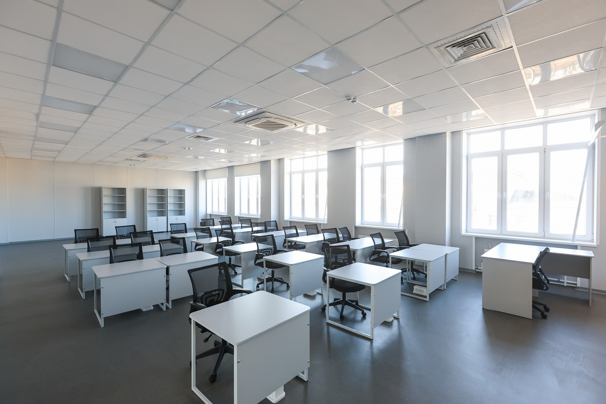Особое внимание уделено доступной среде: входы оборудованы пандусами, в здании установлены лифты и на каждом этаже предусмотрены отдельные санузлы для маломобильных граждан.