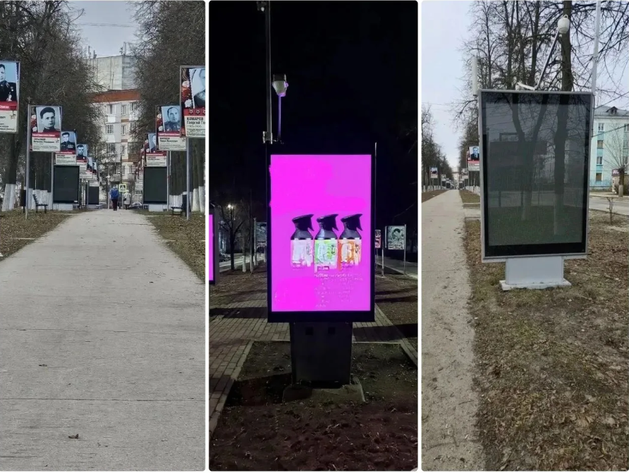 Рядом с портретами жителей города, погибших в годы Великой Отечественной войны, в Афганистане и Чечне, а также пожарных и ликвидаторов последствий аварии на Чернобыльской АЭС, появилось световое табло с рекламой маркетплейсов.