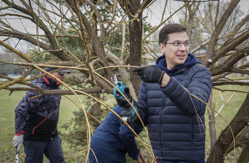 Участники субботника не только убирали мусор и чистили дорожки, но и заботились о зелёных насаждениях. Юрий Шалабаев вместе с экологами кронировал деревья, подрезал кустарники и обрабатывал срезы садовым варом.