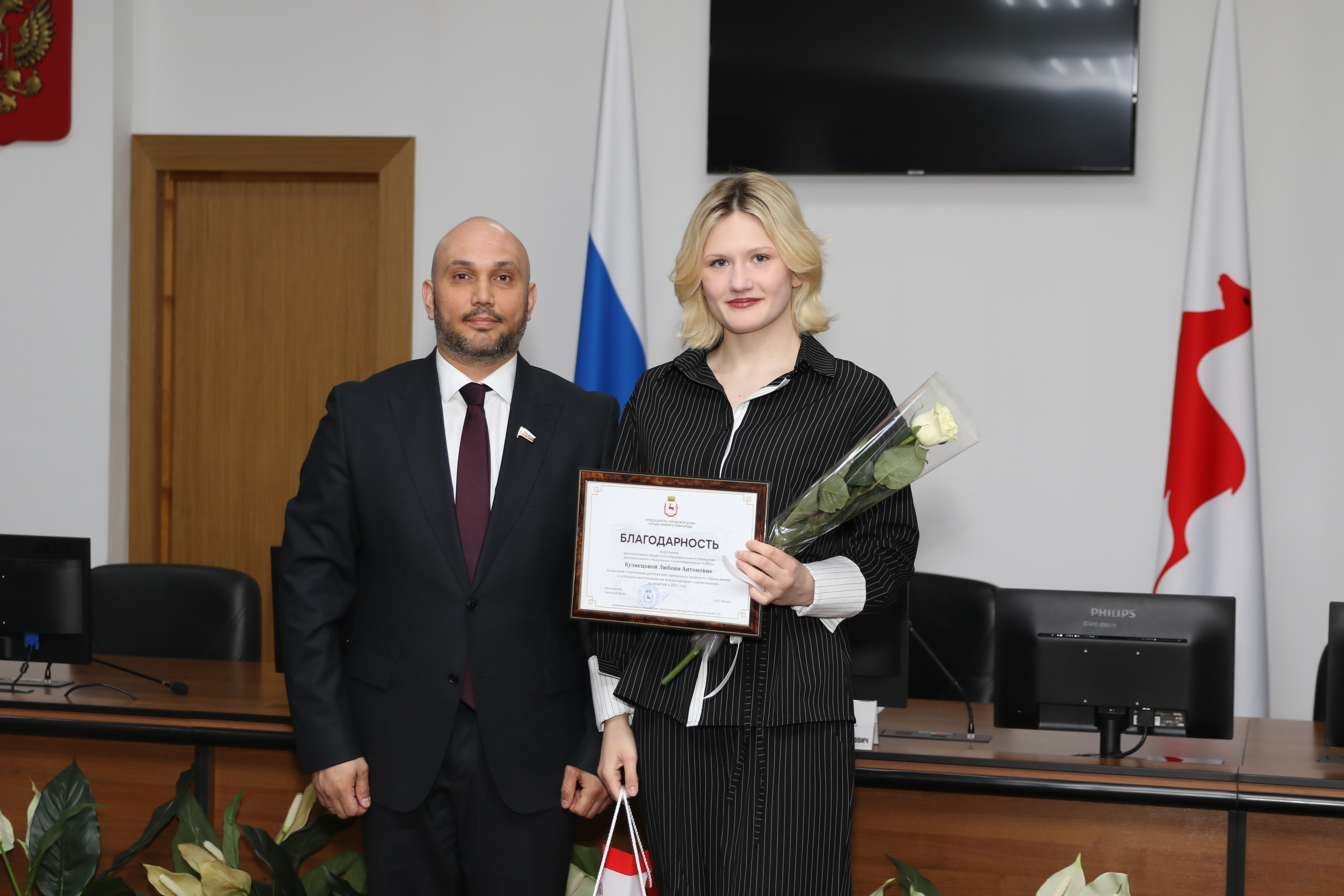 Перед началом заседания состоялась церемония вручения Благодарностей председателя городской Думы за высокие спортивные результаты, вклад в популяризацию ЗОЖ и успешные выступления на международных соревнованиях в 2025 году. Наград удостоены 19 нижегородских спортсменов.