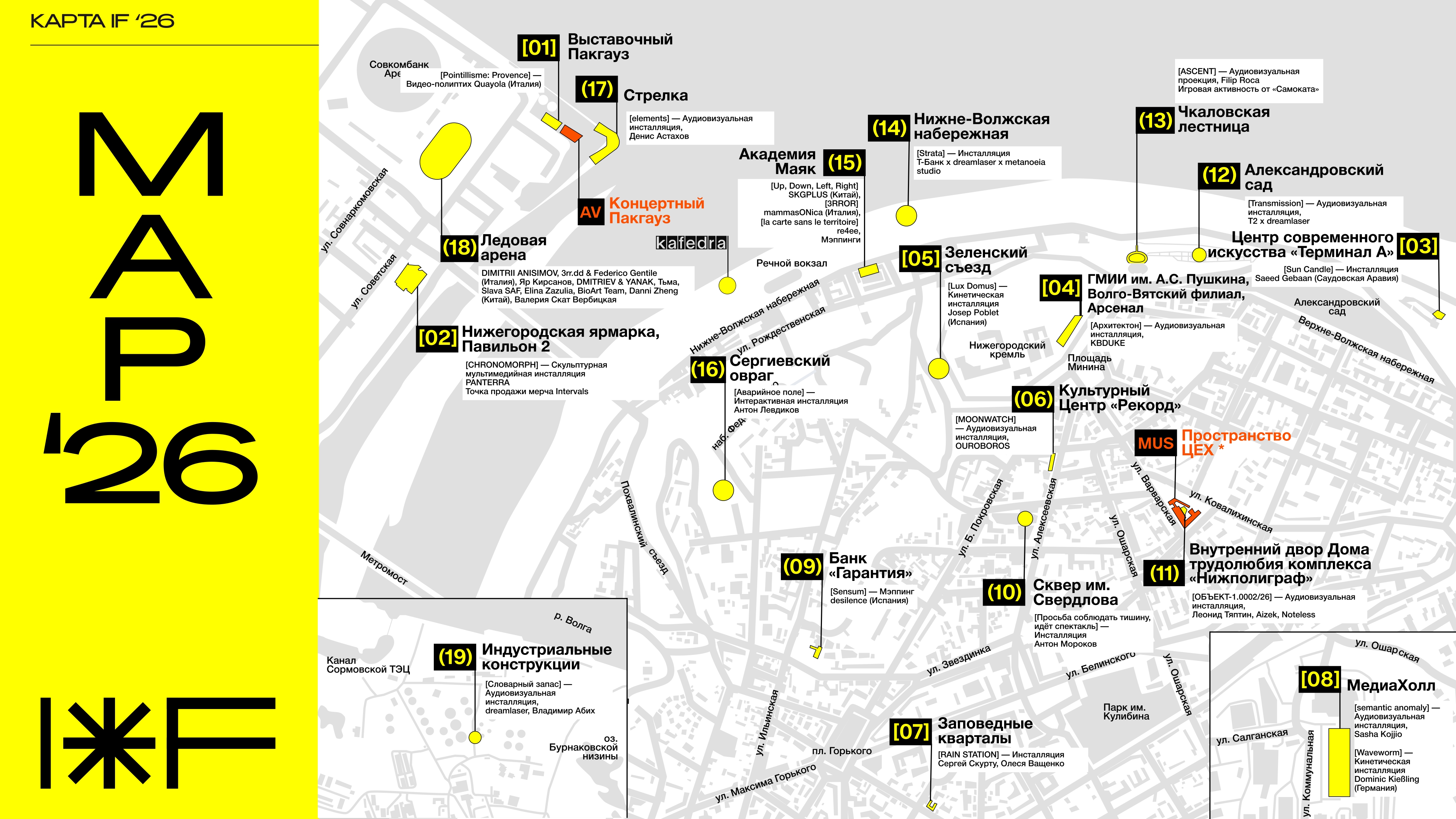 Среди проектов — видеоинсталляция Quayola в Пакгаузе, скульптурная работа CHRONOMORPH от PANTERRA на Нижегородской ярмарке, световая инсталляция Sun Candle Саида Гебаана в ЦСИ "Терминал А", кинетическая работа Lux Domus Жозепа Поблета на Зеленском съезде, аудиовизуальная инсталляция "Архитектон" студии KBDUKE в Арсенале, мэппинги на фасаде Академии Маяк и Чкаловской лестнице, а также проекты в общественных пространствах и промышленных зонах.